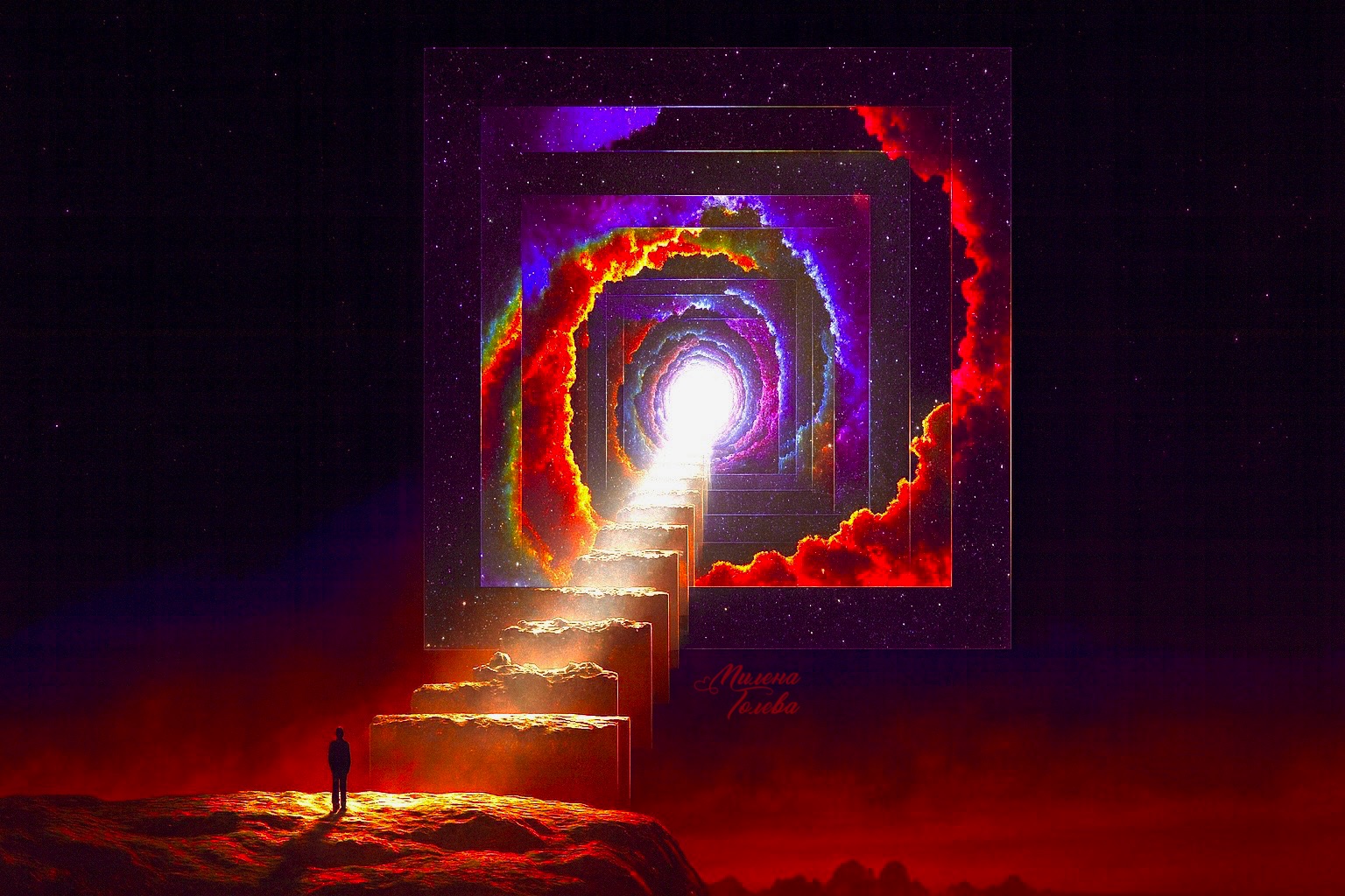 Визуална илюстрация на енергийната трансформация според Науката за Вибрациите на Милена Голева: преход от ниска вибрация на страх и липса (тъмен силует вляво под буреносни облаци) към висока вибрация на увереност и изобилие (сияен силует вдясно сред златни лотоси), осъществен чрез мощен портал на свещена геометрия и енергийна кохерентност.